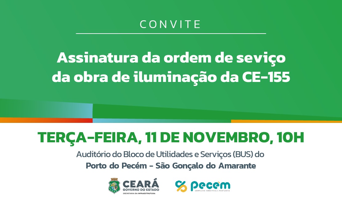 A Secretaria da Infraestrutura do Governo do Ceará (Seinfra) assina ordem de serviço para implantação de iluminação pública ao longo da CE-155, no trecho compreendido entre a BR-222 e o Porto do Pecém, nos municípios de Caucaia e São Gonçalo do Amarante, nesta terça-feira (11), às 10h, no auditório do Bloco de Utilidades e Serviços (BUS) do Porto do Pecém.