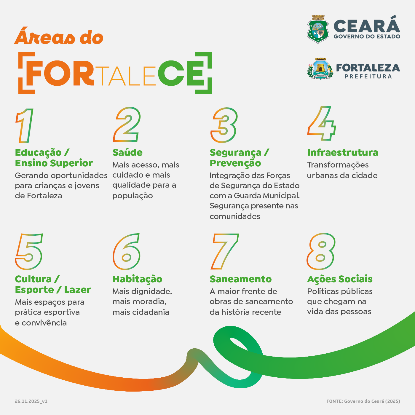 No campo da segurança pública e de outras áreas estruturantes, o FORtaleCE reforça ações de prevenção e atuação nos territórios. O pilar disso é a integração das forças de segurança estaduais com a Guarda Municipal. Há ainda a reforma de Bases de Salvamento Aquático, a construção de uma Central Integrada de Gestão por Videomonitoramento e a requalificação de Bases de Segurança Cidadã. Intervenções em infraestrutura, cultura, esporte, lazer, habitação e saneamento básico também fazem parte do programa, incluindo a maior frente de obras de abastecimento de água e esgotamento sanitário da história recente de Fortaleza, além de políticas sociais que fortalecem renda, mobilidade e proteção social.
