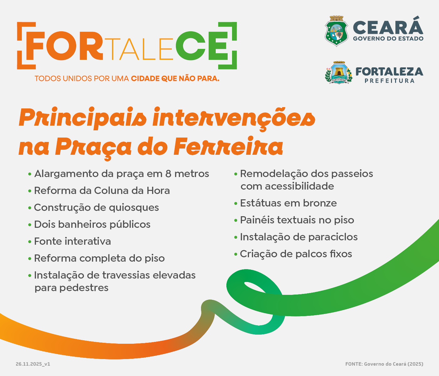O Governo do Ceará e a Prefeitura de Fortaleza lançaram, nesta quarta-feira (26), o programa FORtaleCE, iniciativa que marca uma nova fase de cooperação entre as duas gestões contemplando ações em diversas áreas. A primeira entrega foi a obra de revitalização da Praça do Ferreira, no Centro da Capital, simbolizando o início de um conjunto de investimentos voltados a gerar mais cuidado, oportunidades, segurança, moradia e melhorias urbanas para a população.