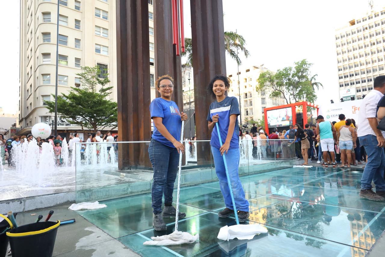 “Eu sempre trouxe meus filhos para cá quando eram pequenos. Além de vê-la linda, ainda participei dessa reforma”, conta a mãe, emocionada. “Aqui na praça eu fiz os rejuntes dos quiosques e a limpeza durante quatro meses de trabalho. Participar desse momento ao lado da minha filha é um prazer muito grande”, acrescenta Rosilane, que é seguida pela filha: “Foi ela que me trouxe aqui para trabalhar e eu fiquei muito feliz. Aqui é o coração de Fortaleza, onde já tivemos vários momentos bons, felizes, e é muito bom contribuir com tudo isso”, diz Weslany.