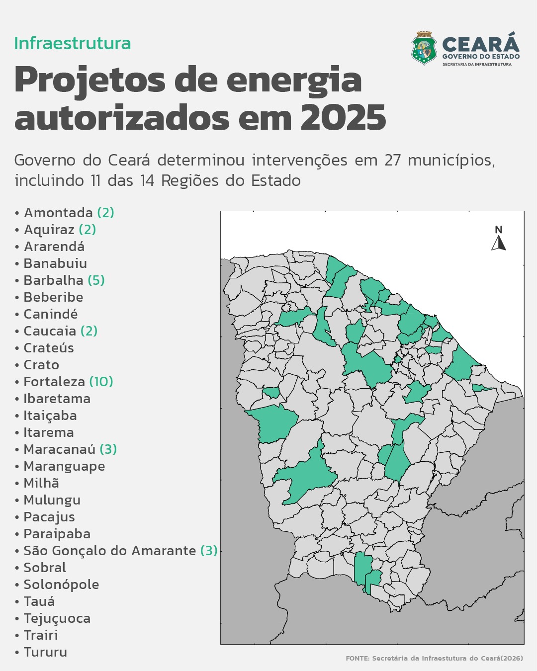 Intervenções e obras de energia elétrica foram autorizadas em 11 das 14 regiões do Estado. De acordo com balanço da Coordenadoria de Energia e Telecomunicações (Coete) da Seinfra, 27 municípios foram atendidos – Amontada, Aquiraz, Ararendá, Banabuiú, Barbalha, Beberibe, Canindé, Caucaia, Crateús, Crato, Fortaleza, Ibaretama, Itaiçaba, Itarema, Maracanaú, Maranguape, Milhã, Mulungu, Pacajus, Paraipaba, São Gonçalo do Amarante, Sobral, Solonópole, Tauá, Tejuçuoca, Trairi e Tururu. As obras incluem construção e ampliação de rede subterrânea e de baixa, média e alta tensão; construção de nova subestações; e remanejamento de rede.